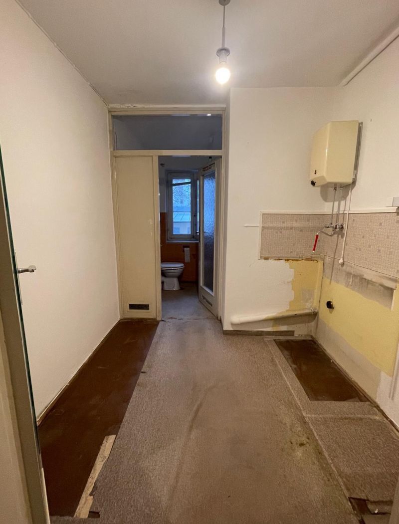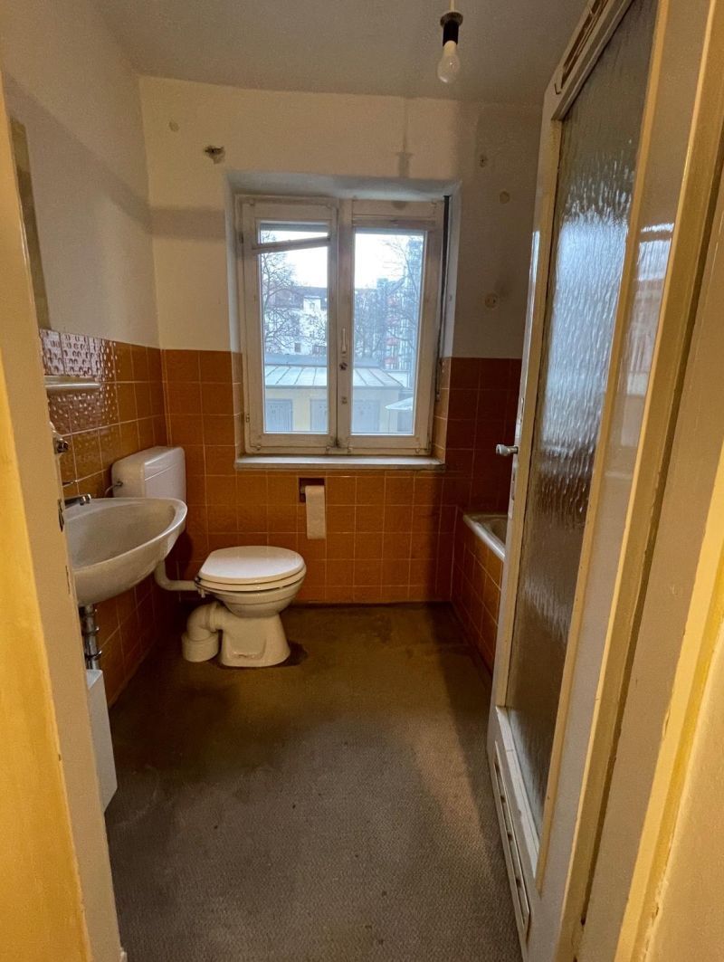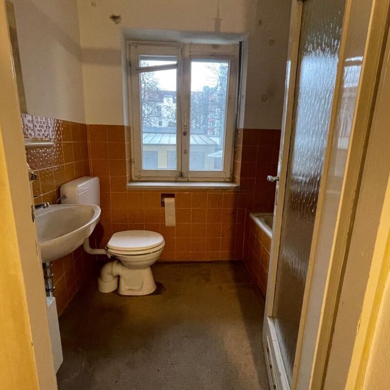 dar. Die Wohnung besteht aus einem hellen Wohn/ Schlafraum, einer kleinen Diele, die direkt in eine „Durchgangsküche“ führt. Von der Küche aus folgt dann das WC/Duschbad. Die Wohnung ist renovierungsbedürftig und kann somit ganz nach Ihren eigenen Wünschen neu gestaltet werden. Das Treppenhaus ist hell und großzügig.